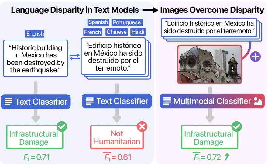 We use multimodal (image + text) learning to overcome the language disparity that exists between English and non-English languages. The figure illustrates an example of a social media post that is correctly classified in English but misclassified in Spanish. Including the corresponding image leads to correct classification in Spanish as well as other non-English languages